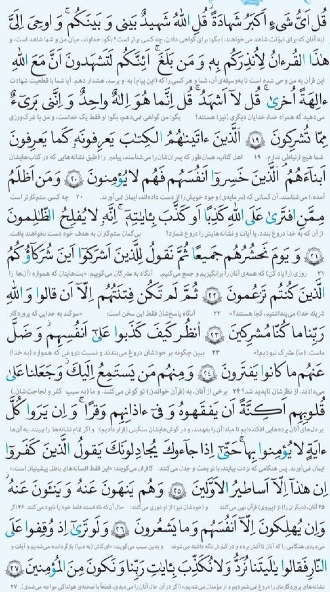 متن و معنی آیات ۱۹ تا ۲۷ سوره مبارکه انعام به شرح زیر است: