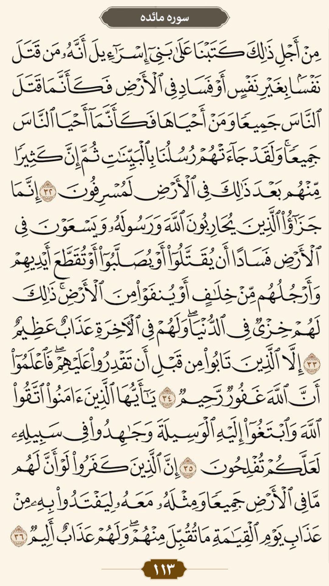 متن و معنی آیات ۳۲ تا ۳۶ سوره مبارکه مائده به شرح زیر است: