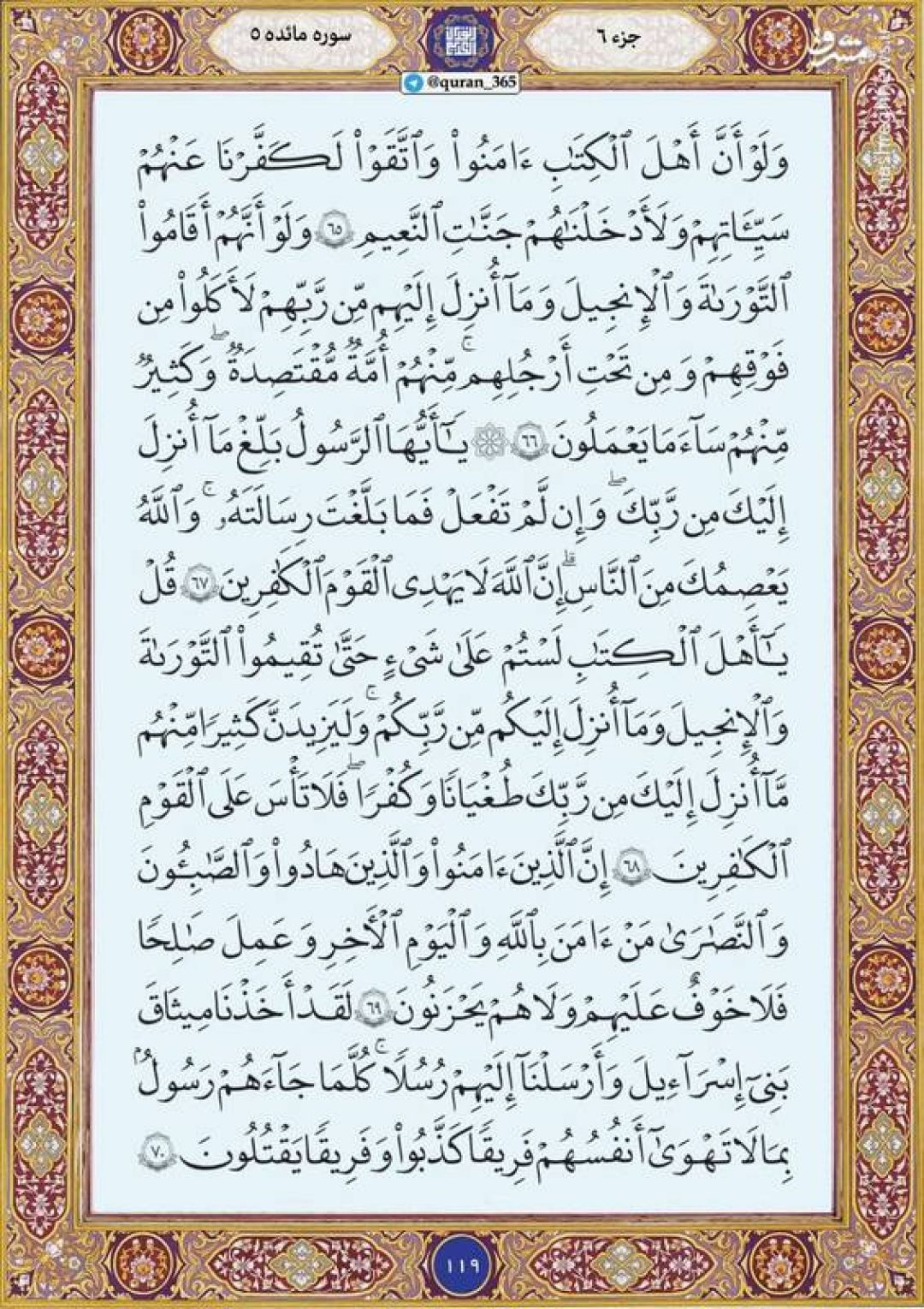 صبح خود را با تلاوت آیات ۶۵ تا ۷۰ سوره مبارکه مائده صفحه ۱۱۹ کلامالله مجید آغاز کنیم.