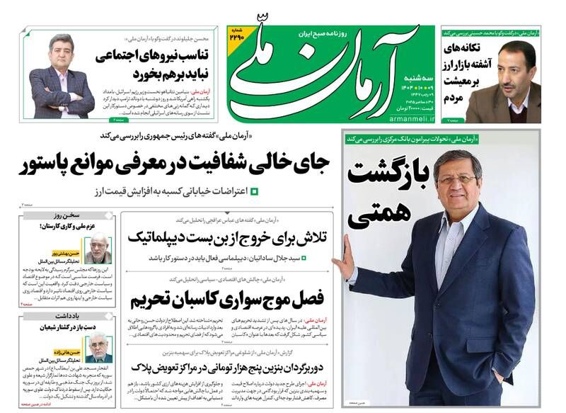 به گزارش شبکه اطلاعرسانی «مرصاد»؛ انتقاد برخی بازاریان به نوسانات ارز و سوءاستفاده عوامل داخلی دشمن، حقوقها باید افزایش یابد، بازگشت همتی، استقبال بازار از خبر آمدن همتی و...از جمله تیترهای روزنامههای سهشنبه ۹ دی هستند.