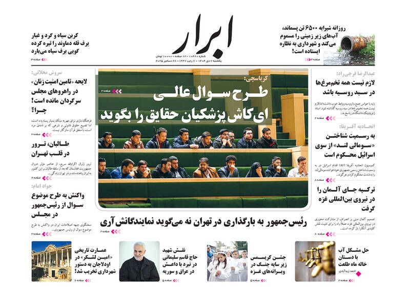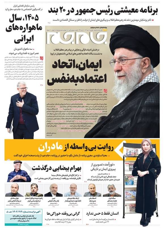 به گزارش شبکه اطلاعرسانی «مرصاد»؛ ایران پرچمدار تغییر نظم ناعادلانه جهان است، تهاجم آمریکا مغلوب جوانان ایران شد، بیضایی در غربت از دنیا رفت، ایران به دنبال نظم عادلانه ملی و…از جمله تیترهای روزنامههای یکشنبه هفتم دیماه هستند.
