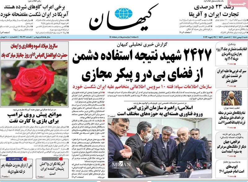 به گزارش شبکه اطلاعرسانی «مرصاد»؛ ۲ هزار و ۴۲۷ شهید نتیجه استفاده دشمن از فضای بیدر و پیکر مجازی، روایت غرب از امپریالیسم ترامپ، چه کسی فرمان خشونت داد، آیندهای روشن خواهیم داشت و…از جمله تیترهای روزنامههای شنبه ۴ بهمن ۱۴۰۴ هستند.