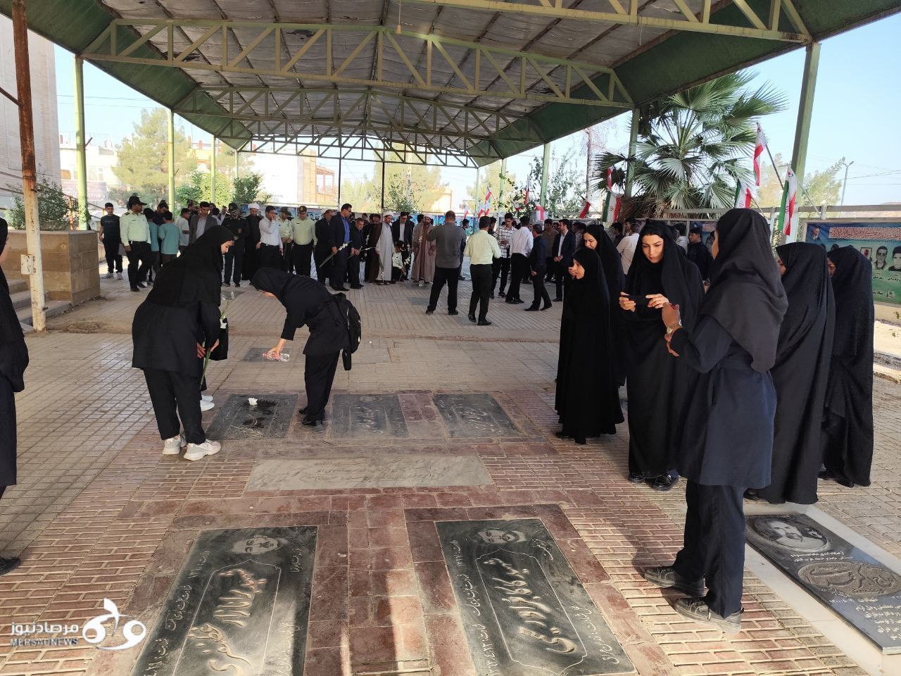 بهمناسبت هفته بسیج دانشآموزی، گلزار مطهر شهدای احمد ابن اسحاق (ره) با حضور جمعی از دانشآموزان، فرهنگیان و مسئولان آموزش و پرورش غبارروبی و عطرافشانی شد.
