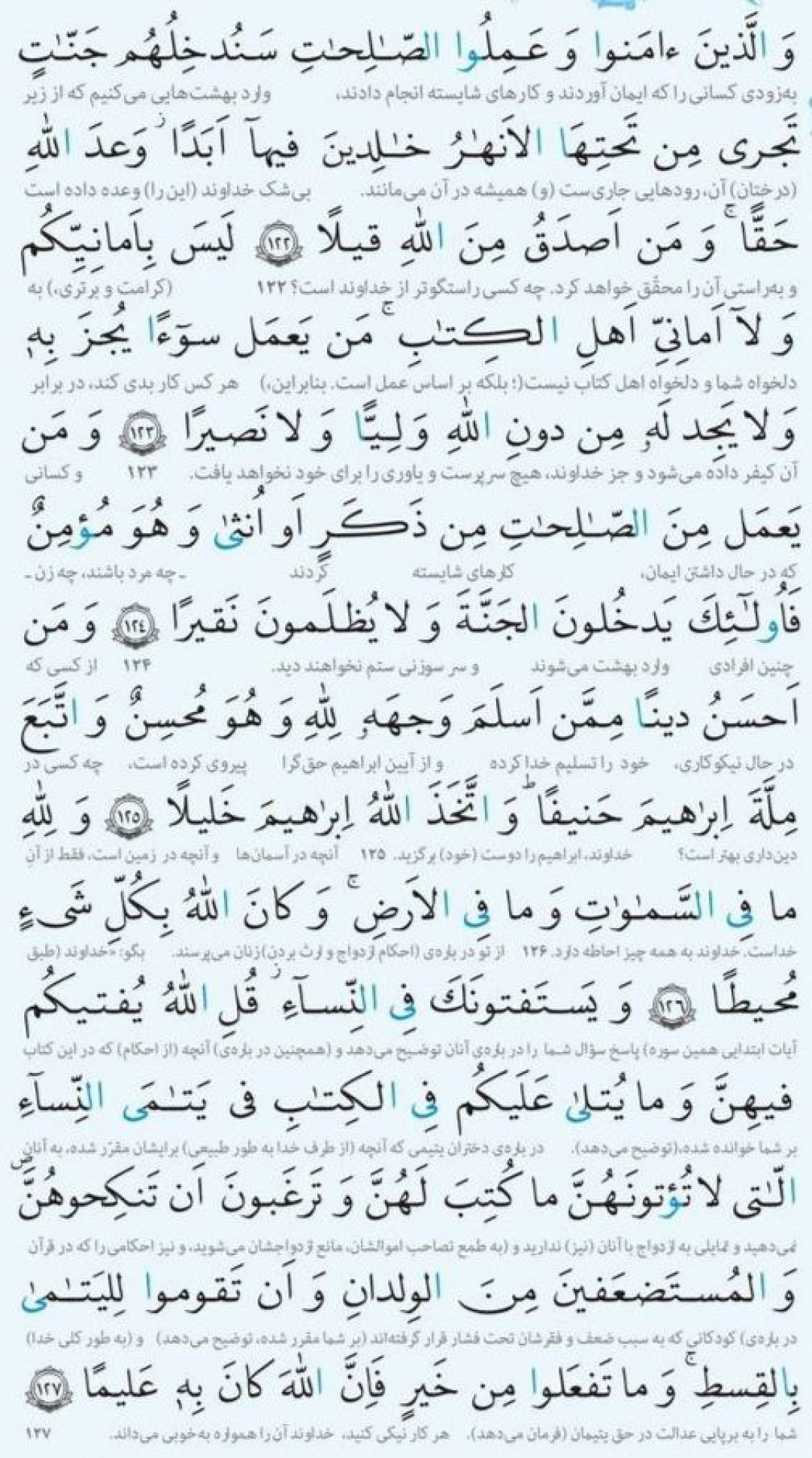 متن و معنی آیات ۱۲۲ تا ۱۲۷ سوره مبارکه نساء به شرح زیر است:
