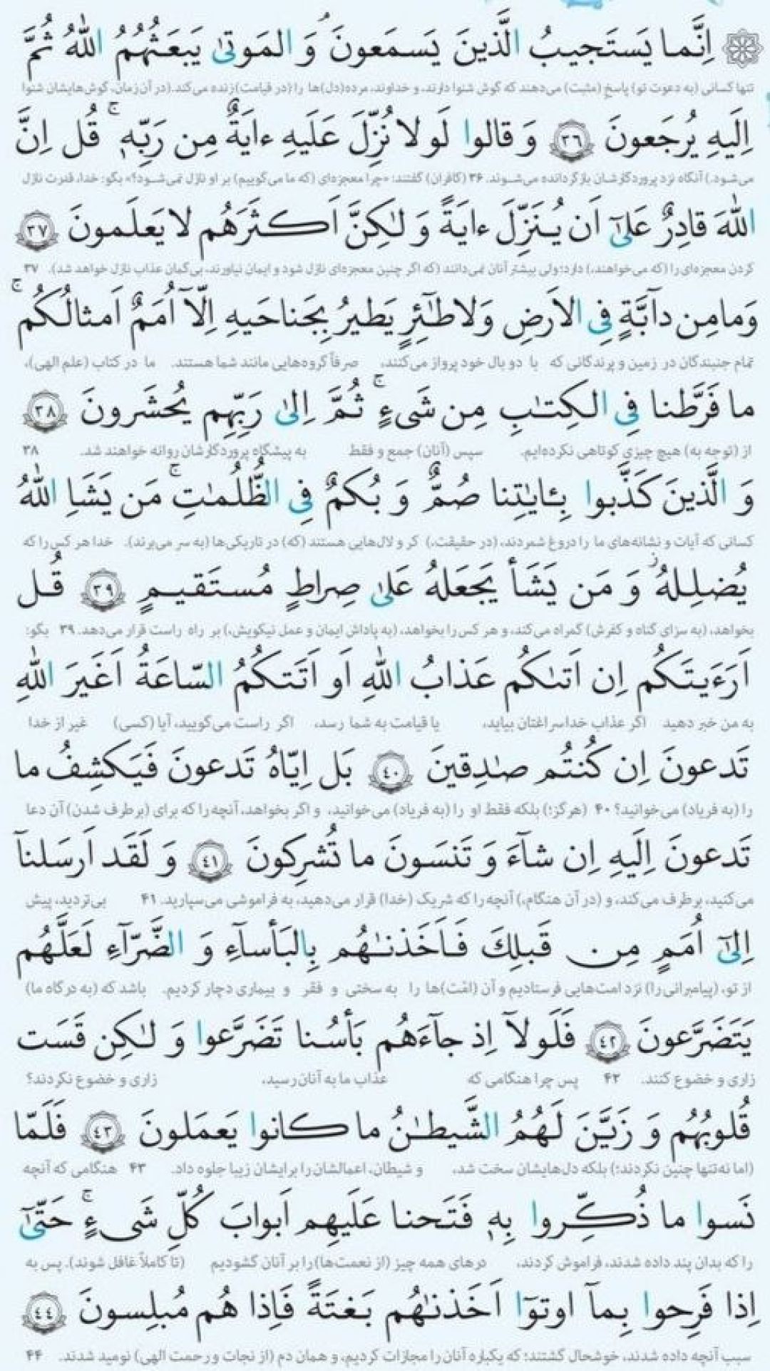 متن و معنی آیات ۳۶ تا ۴۴ سوره مبارکه انعام به شرح زیر است: