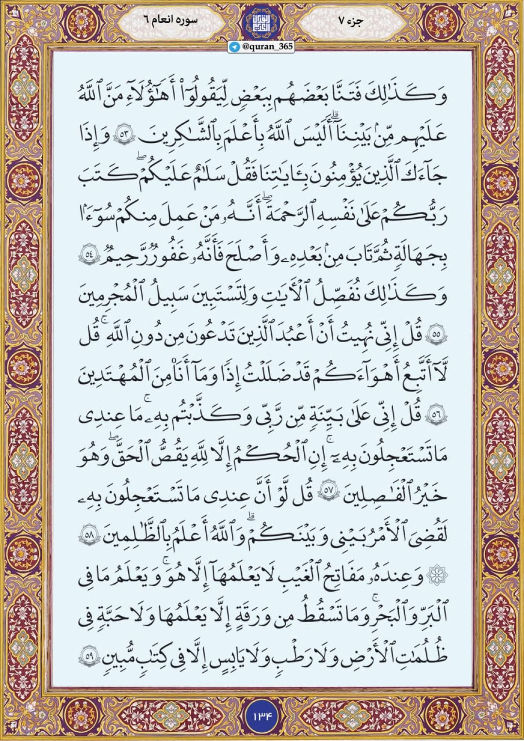 صبح خود را با تلاوت آیات ۵۳ تا ۵۹ سوره مبارکه «انعام»، صفحه ۱۳۴ کلامالله مجید آغاز کنیم.