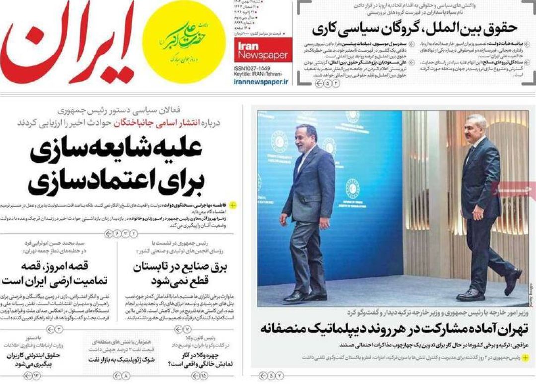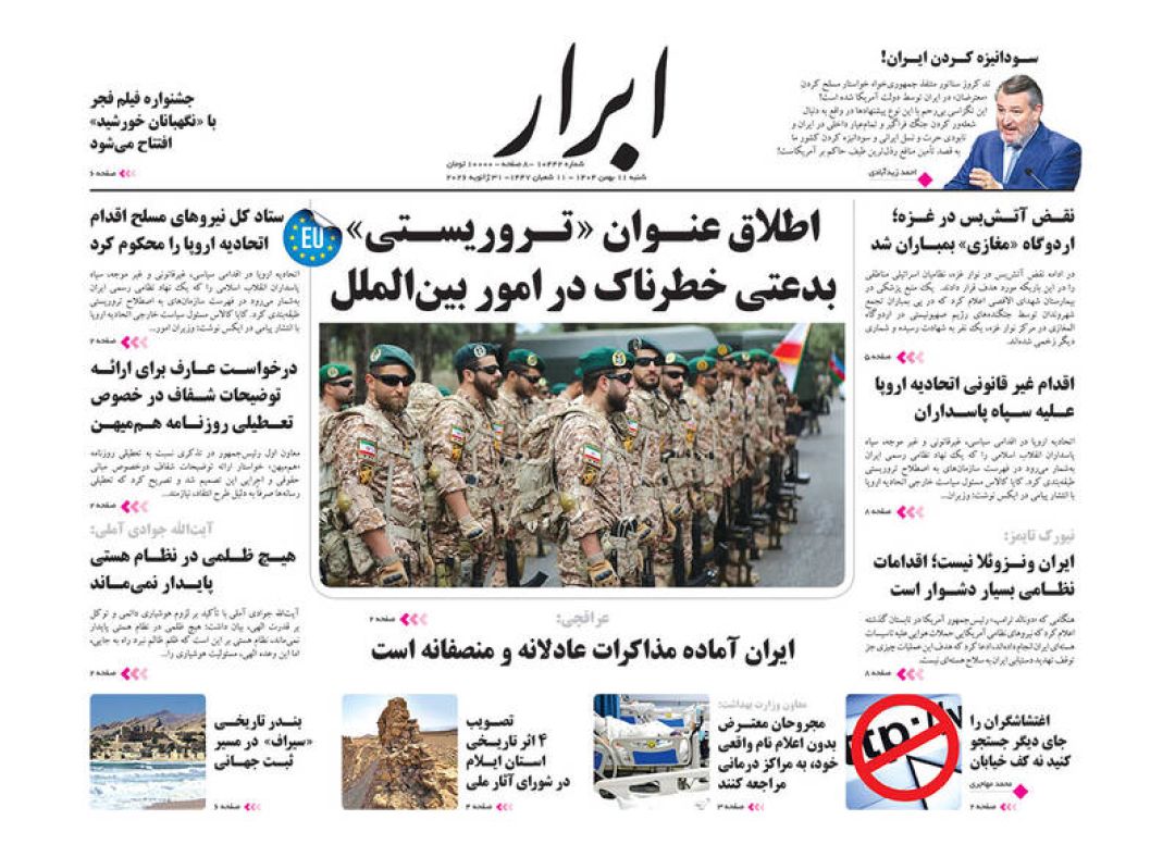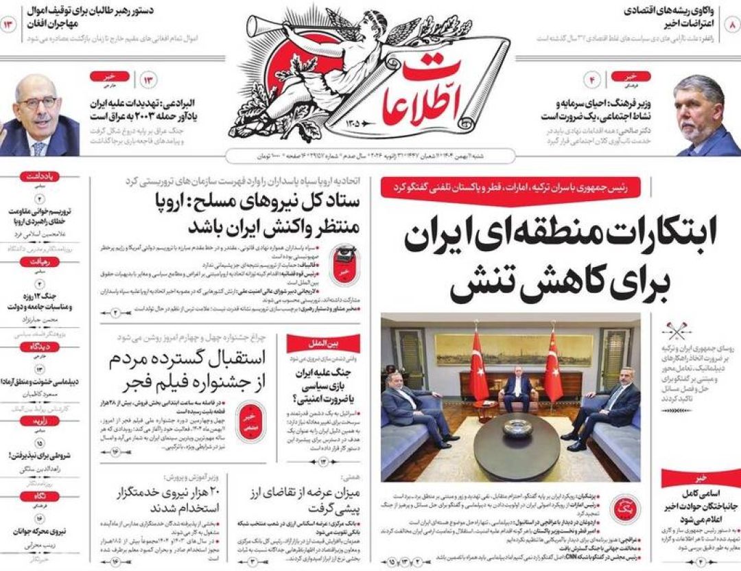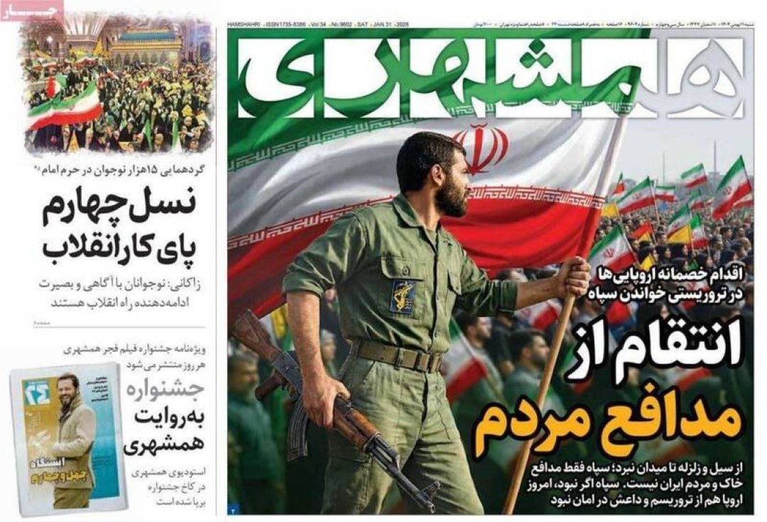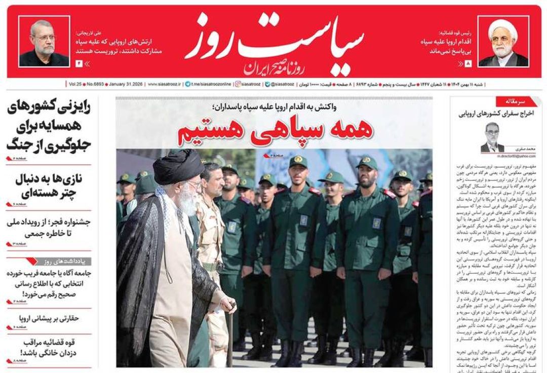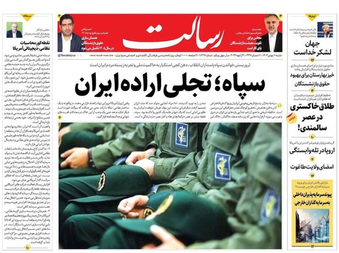 به گزارش شبکه اطلاعرسانی «مرصاد»؛ سفرای اتحادیه اروپا را اخراج کنید، سپاه خار چشم آمریکا و اسرائیل است، فرصت مذاکره یا فریب جنگ، تروریست شمایید، اروپای ضعیف نانجیب و…از جمله تیترهای روزنامههای شنبه یازدهم بهمن ۱۴۰۴ هستند.
