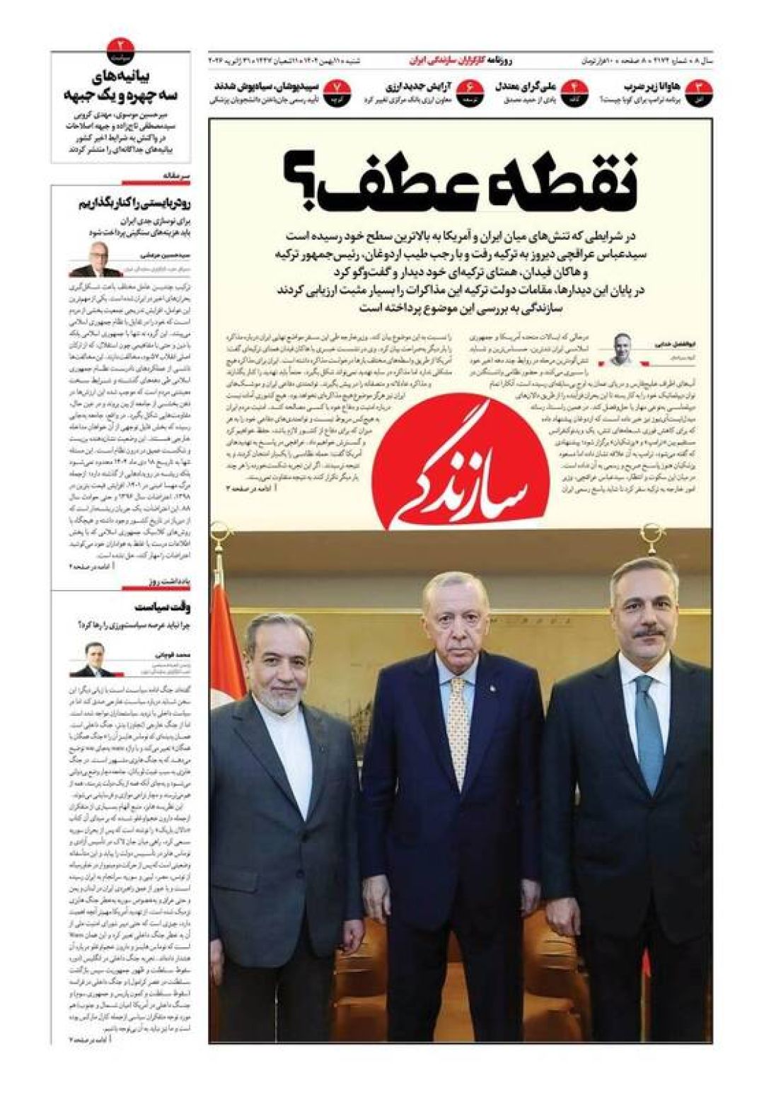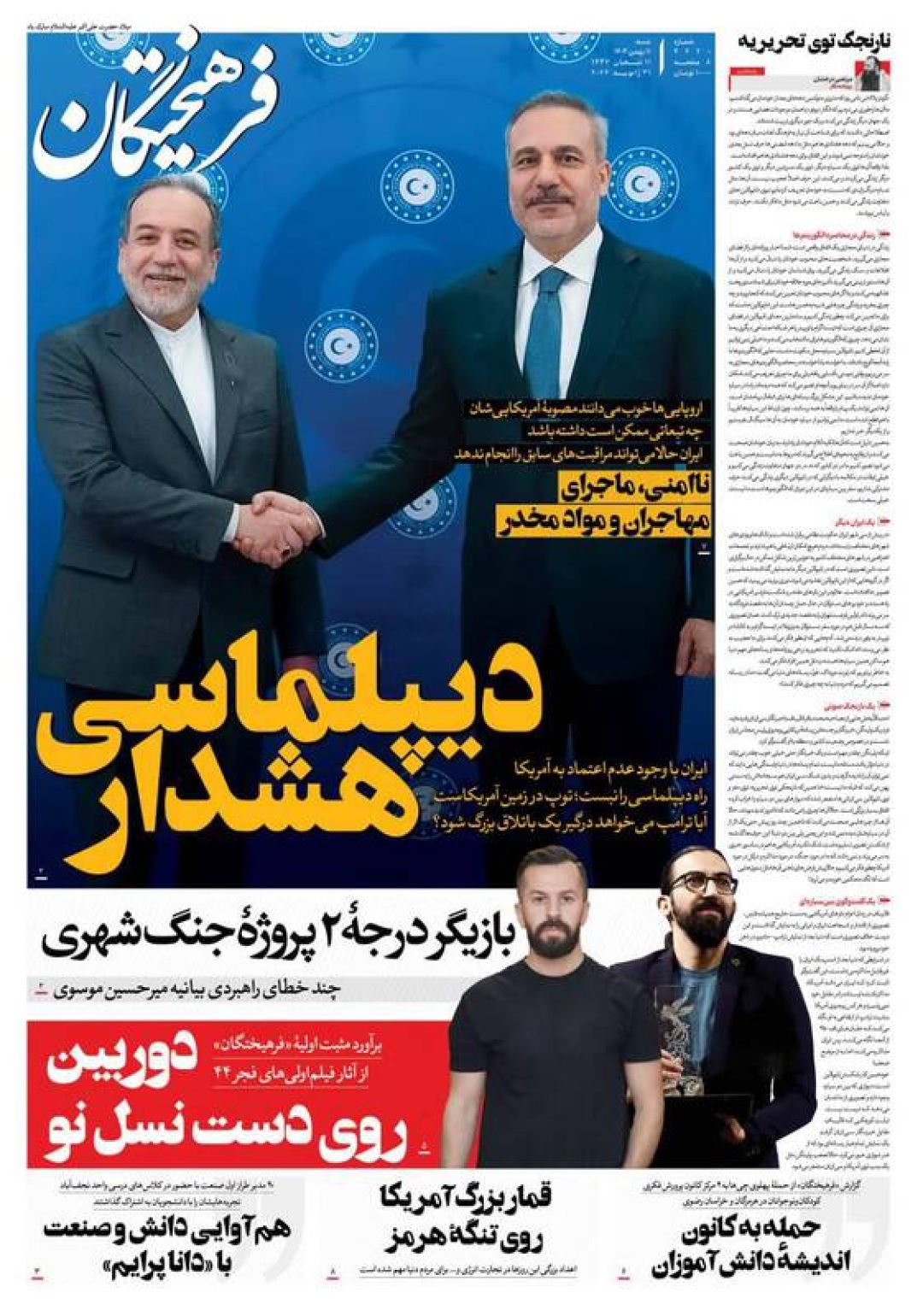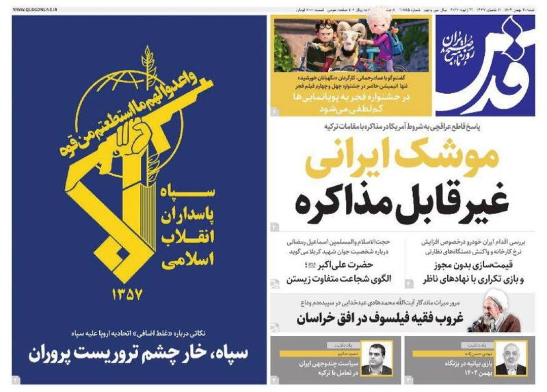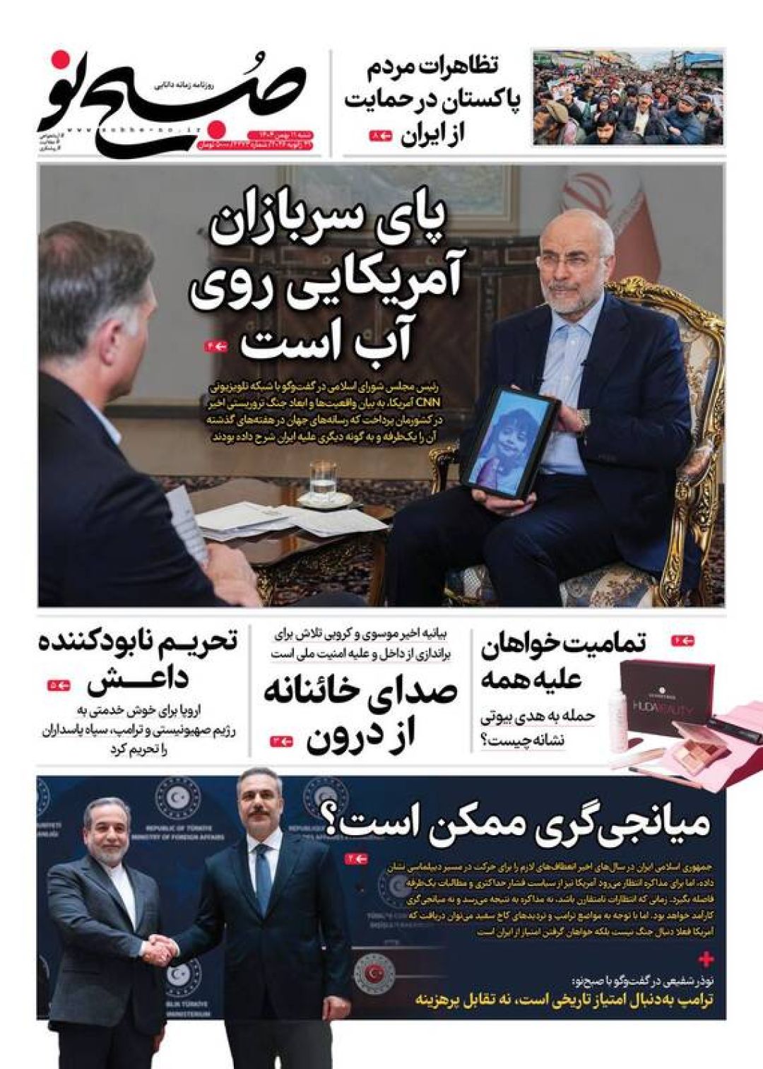 به گزارش شبکه اطلاعرسانی «مرصاد»؛ سفرای اتحادیه اروپا را اخراج کنید، سپاه خار چشم آمریکا و اسرائیل است، فرصت مذاکره یا فریب جنگ، تروریست شمایید، اروپای ضعیف نانجیب و…از جمله تیترهای روزنامههای شنبه یازدهم بهمن ۱۴۰۴ هستند.