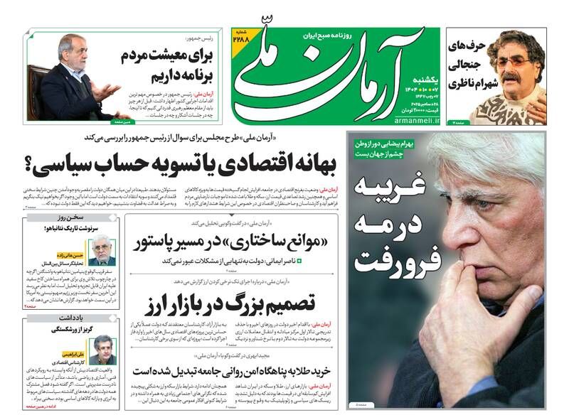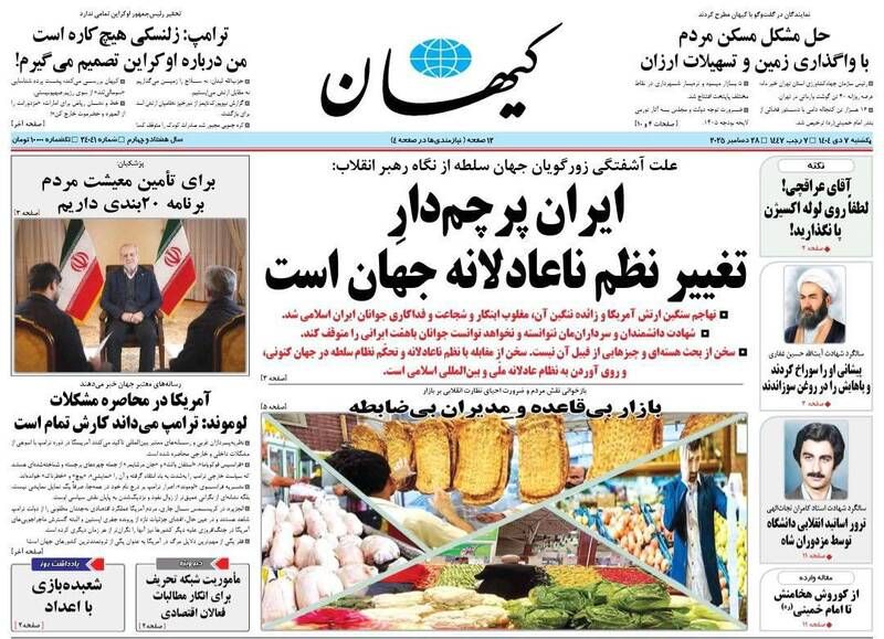 به گزارش شبکه اطلاعرسانی «مرصاد»؛ ایران پرچمدار تغییر نظم ناعادلانه جهان است، تهاجم آمریکا مغلوب جوانان ایران شد، بیضایی در غربت از دنیا رفت، ایران به دنبال نظم عادلانه ملی و…از جمله تیترهای روزنامههای یکشنبه هفتم دیماه هستند.